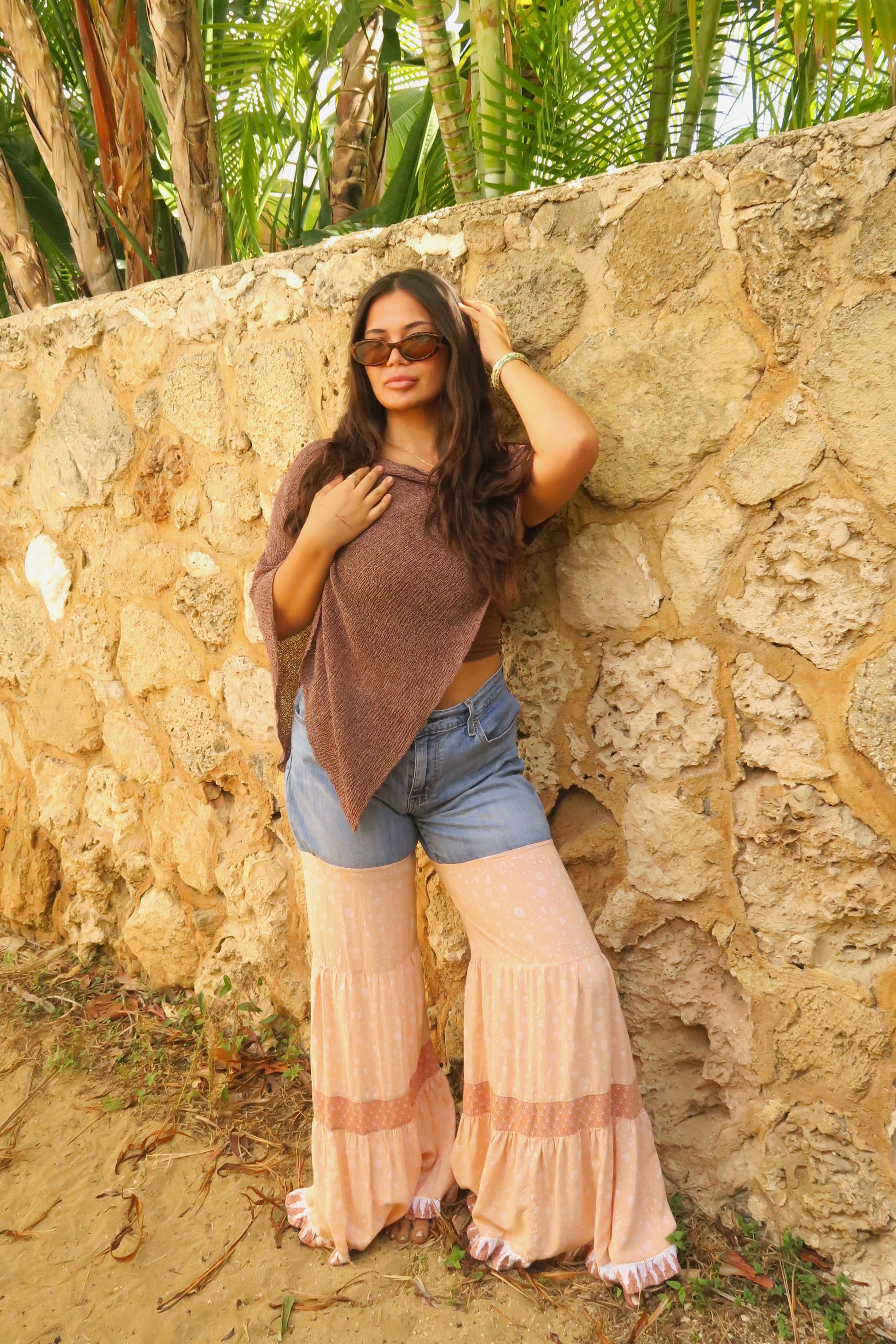 Crafted from upcycled Levi’s denim and soft peach floral fabric, these flares blend vintage charm with a free-spirited boho vibe. The mid-rise denim flows into tiered, wide legs with delicate floral patterns and contrasting bands for an effortless, feminine look. Original Levi’s tag size 33 — pulled tighter to fit the model. Denim has a comfortable stretch.