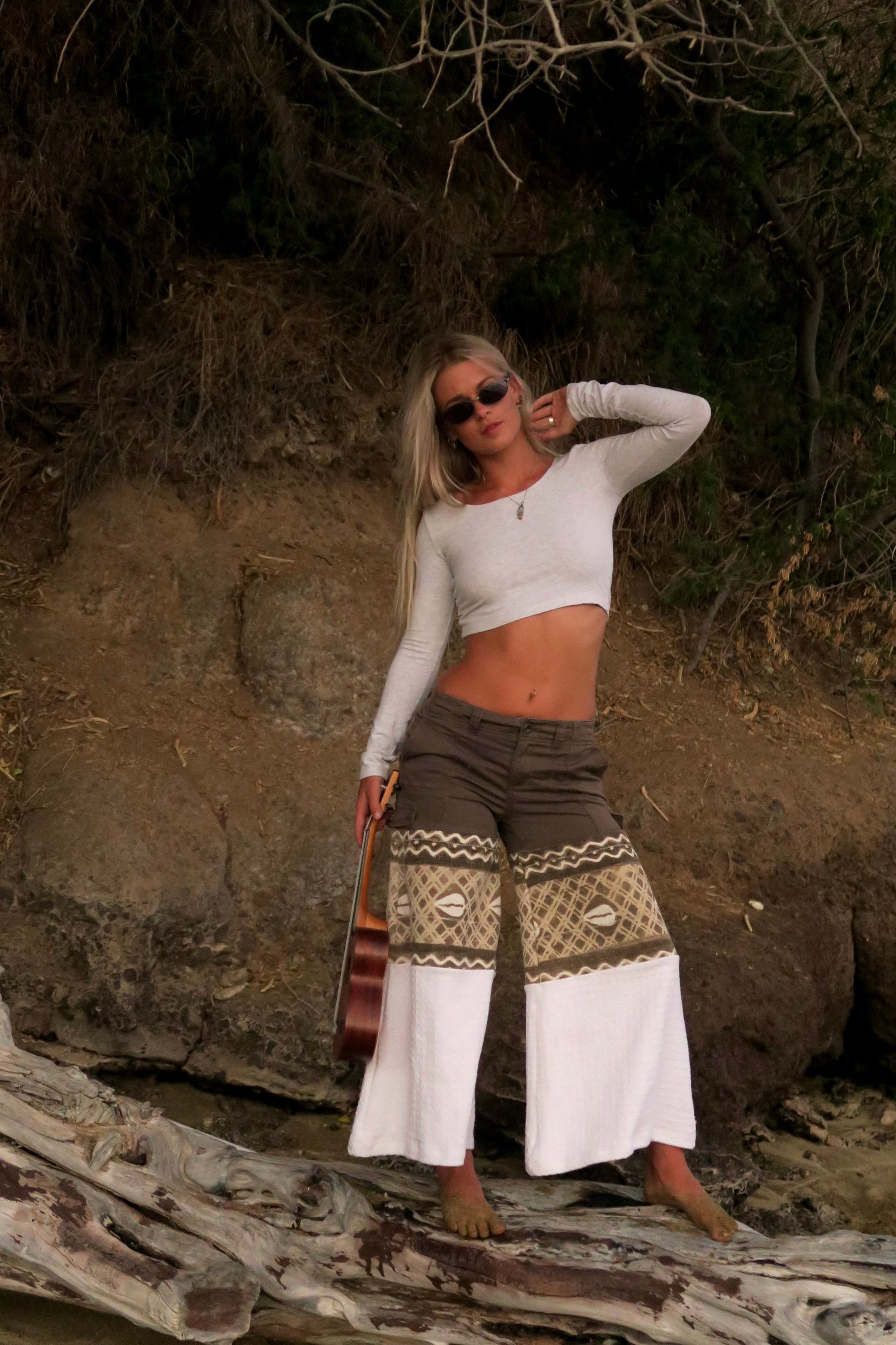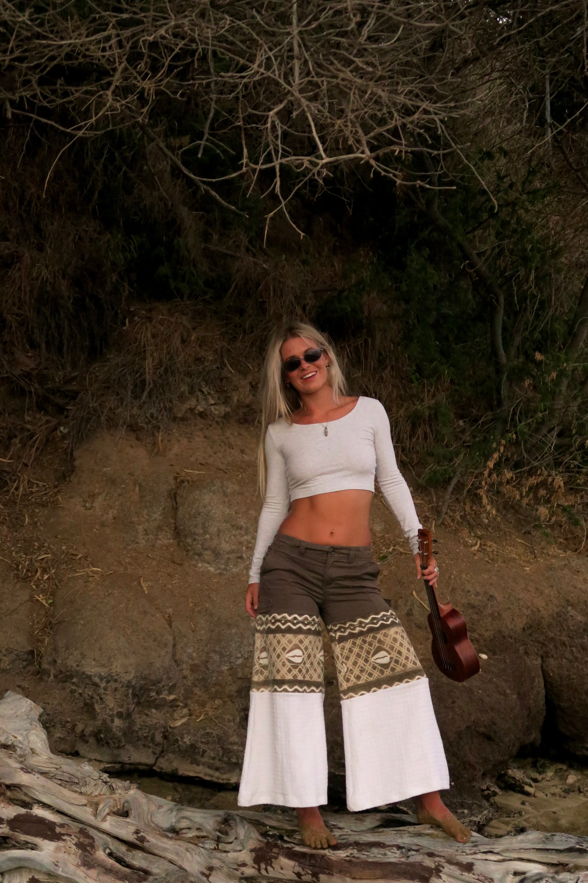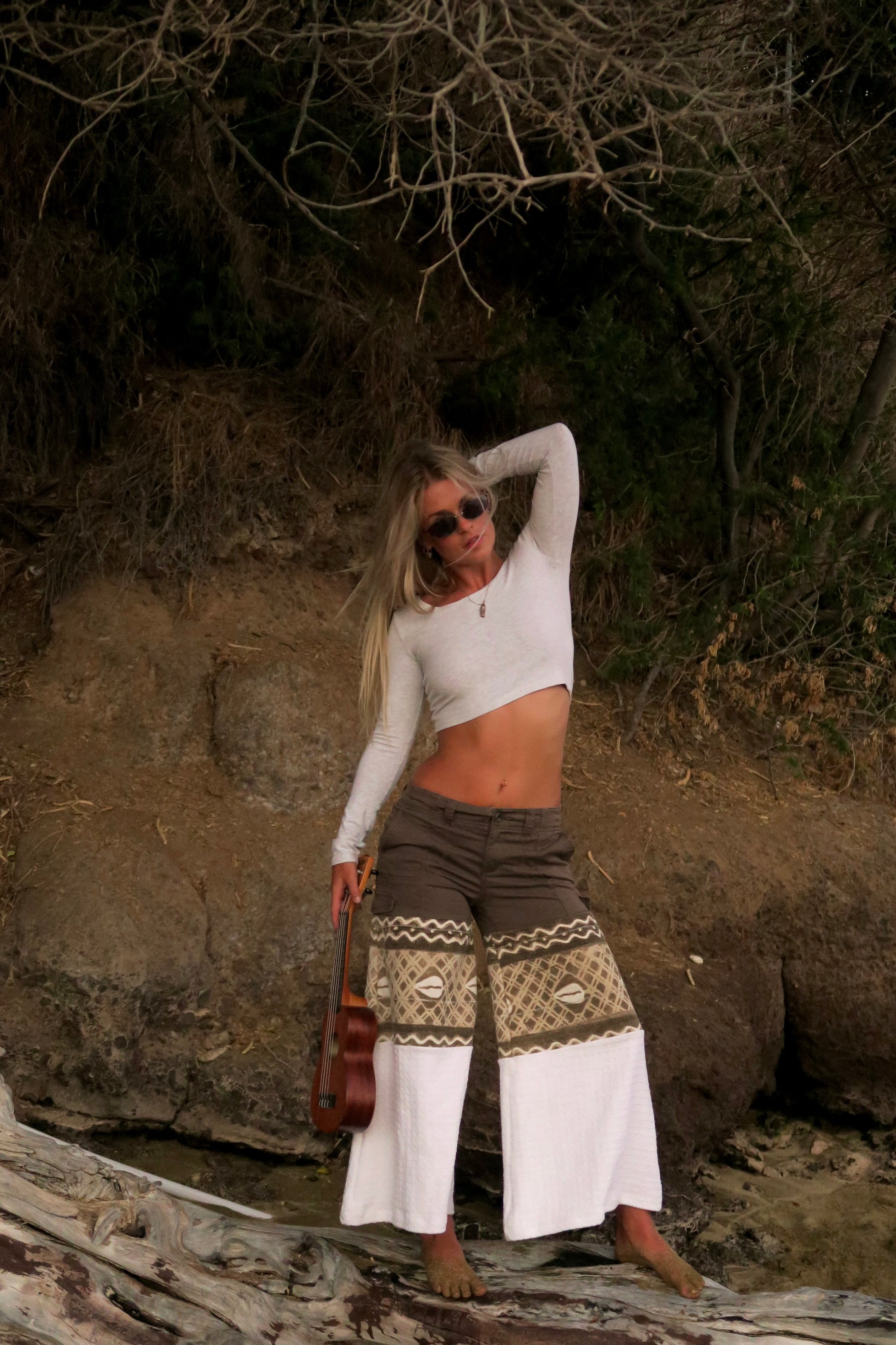 Earthy tones meet island soul — these upcycled wide-leg pants feature hand-sewn shell-inspired detailing and creamy white panels that flow effortlessly. The back waistband offers a hint of stretch for comfort, while the petite fit flatters a smaller frame.