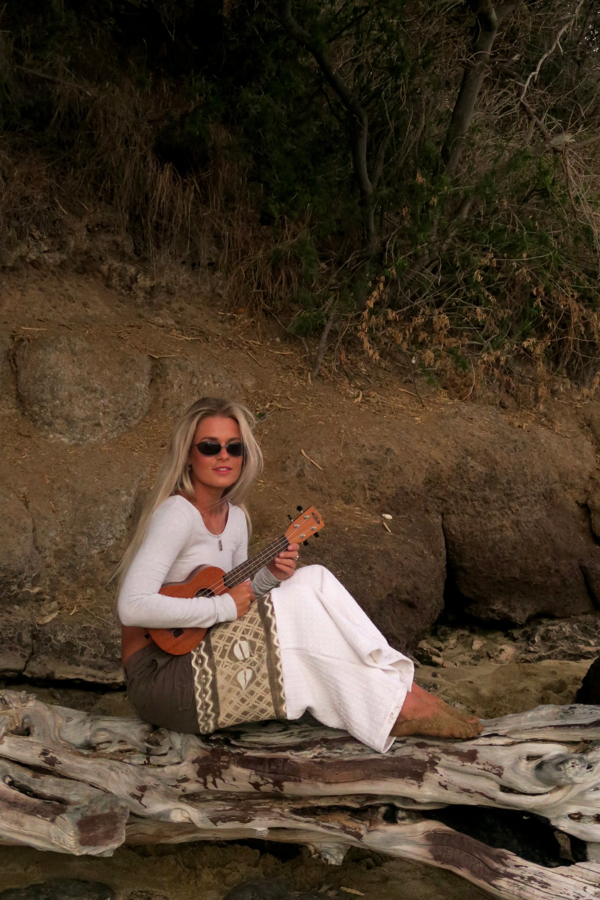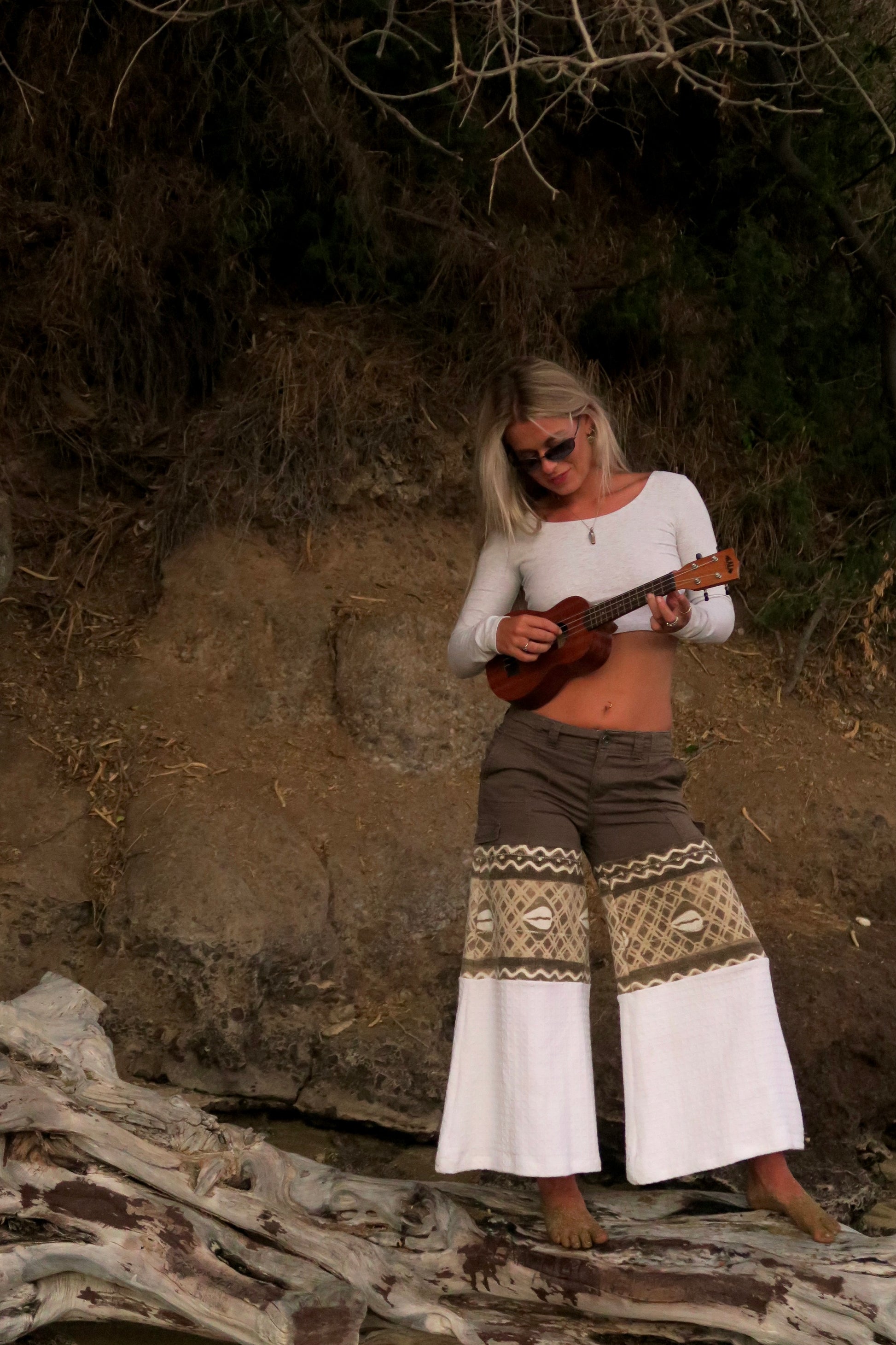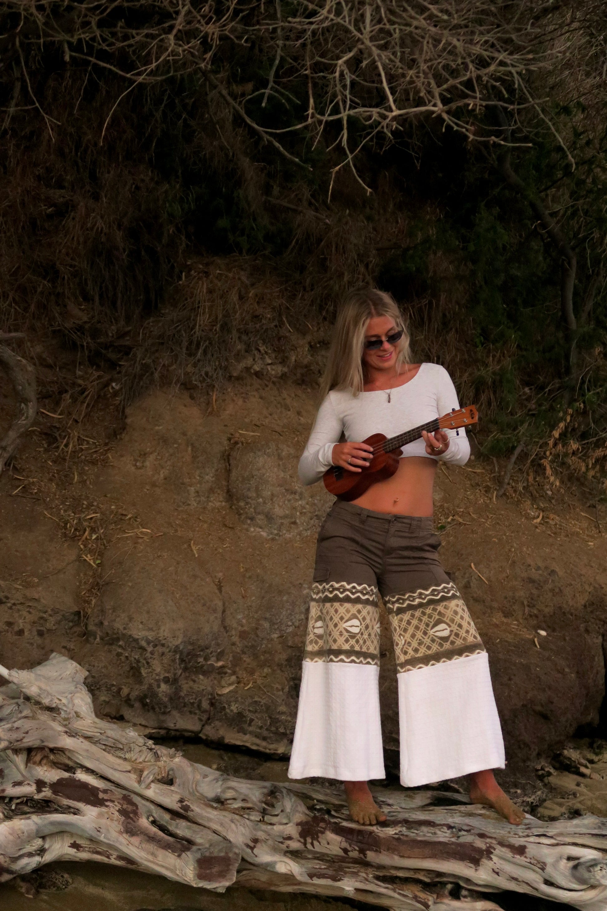 Earthy tones meet island soul — these upcycled wide-leg pants feature hand-sewn shell-inspired detailing and creamy white panels that flow effortlessly. The back waistband offers a hint of stretch for comfort, while the petite fit flatters a smaller frame.